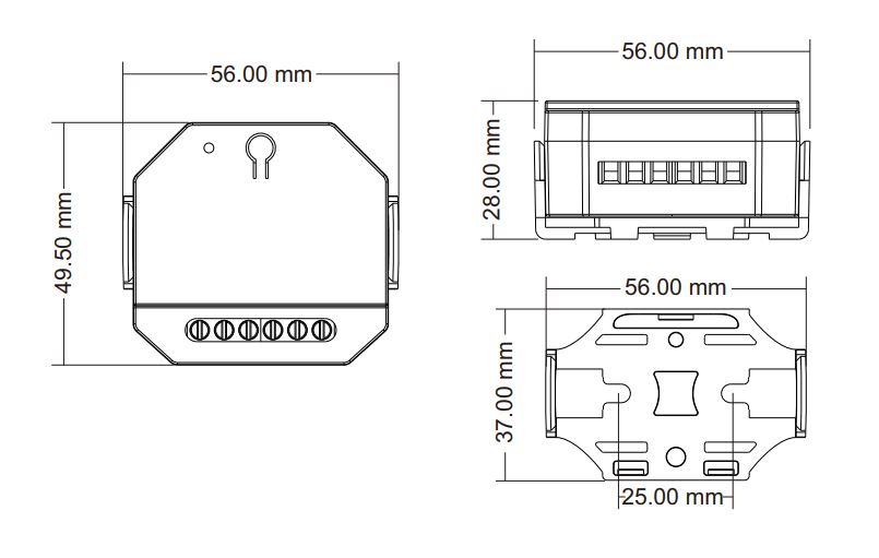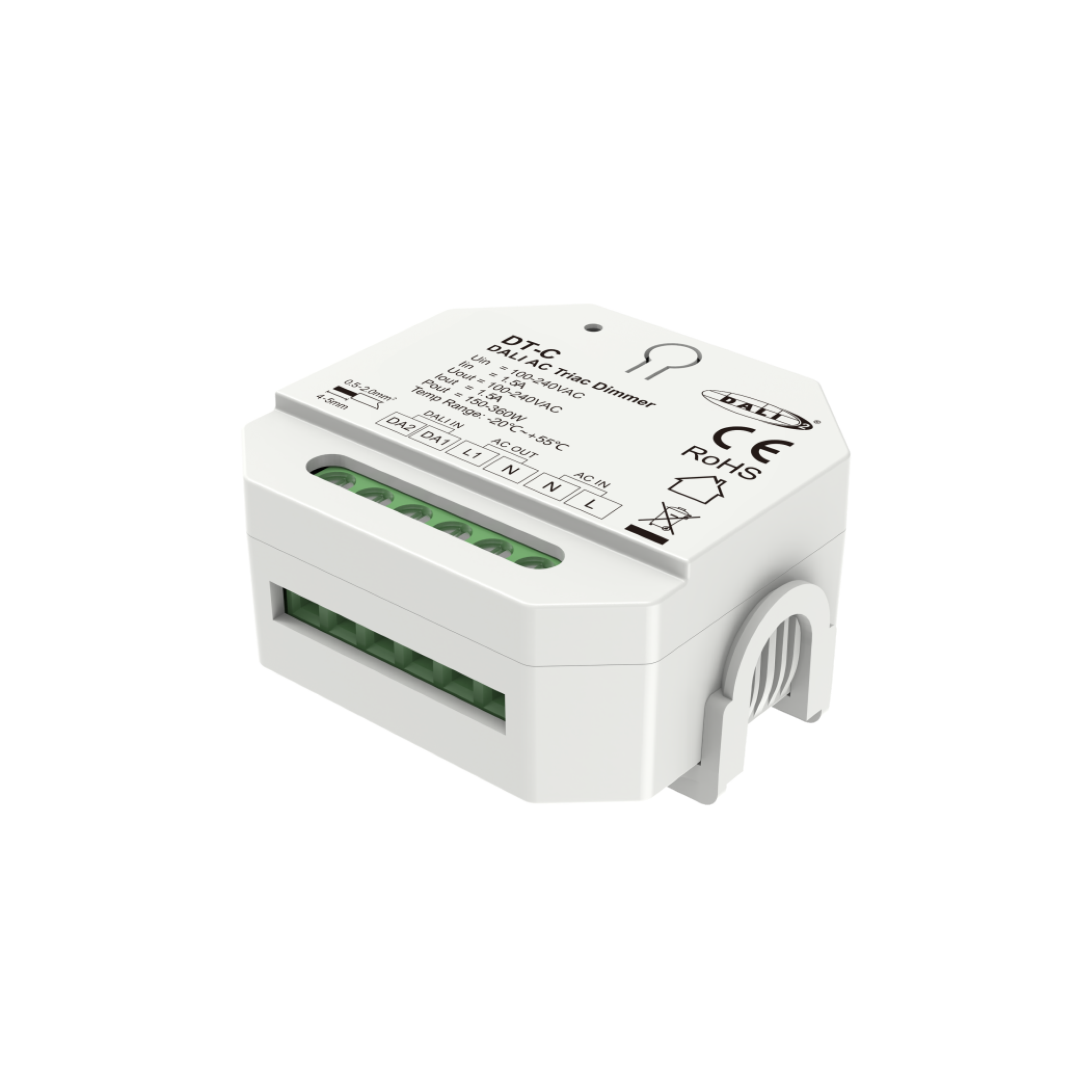 The DTC controller is a single-channel AC phase-cut DALI dimmer with one DALI address and one channel output, designed for smooth dimming and switching of single colour dimmable LED strips/lamps, as well as traditional incandescent and halogen lighting. It is DALI-2 certified and fully compliant, ensuring reliable compatibility with DALI systems from leading international manufacturers. The DALI address is automatically assigned by the DALI master for easy setup. Users can select leading-edge or trailing-edge dimming modes, adjust minimum brightness levels, and connect an external push switch for convenient on/off and 0–100% dimming control. Built-in overheat and overload protection ensures safe, dependable operation with automatic recovery.