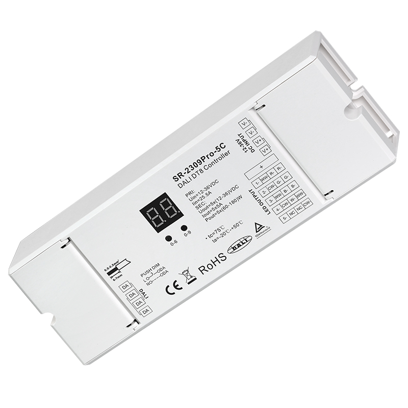 LCDMSR-2309 DALI-2 DT8 constant voltage controller features five PWM output channels with support for colour temperature and RGB colour control. It supports both single and multi-address DT8 device types, manual address setting with display, push-dim control without DALI, USB configuration, and is compatible with universal DT8 DALI masters.