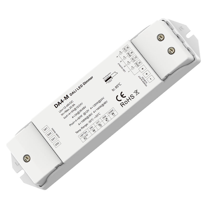 The DA4M is a 5A x 4 channel constant voltage DALI DT8 LED controller which supports 12–48V operation and delivers precise multi-channel lighting control. It features PWM digital dimming with a standard DALI logarithmic dimming curve for smooth, accurate light adjustment. Designed with four DALI address inputs and four channel outputs, each address is automatically assigned by the DALI master controller for simple configuration. For larger installations, higher loads can be easily managed using compatible data repeaters.
