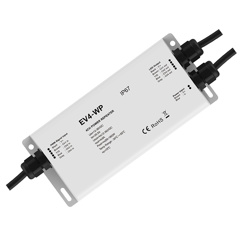 Engineered for demanding outdoor and damp environments, this 12-36V constant voltage data repeater features a fully sealed IP67 rated housing for reliable weatherproof performance. With four independent output channels delivering up to 5A per channel, it boosts PWM control signals while supporting unlimited expansion via series or parallel connections. Ideal for single colour, dual colour, RGB, and RGBW constant voltage LED strips and modules, it ensures stable power delivery and consistent brightness.