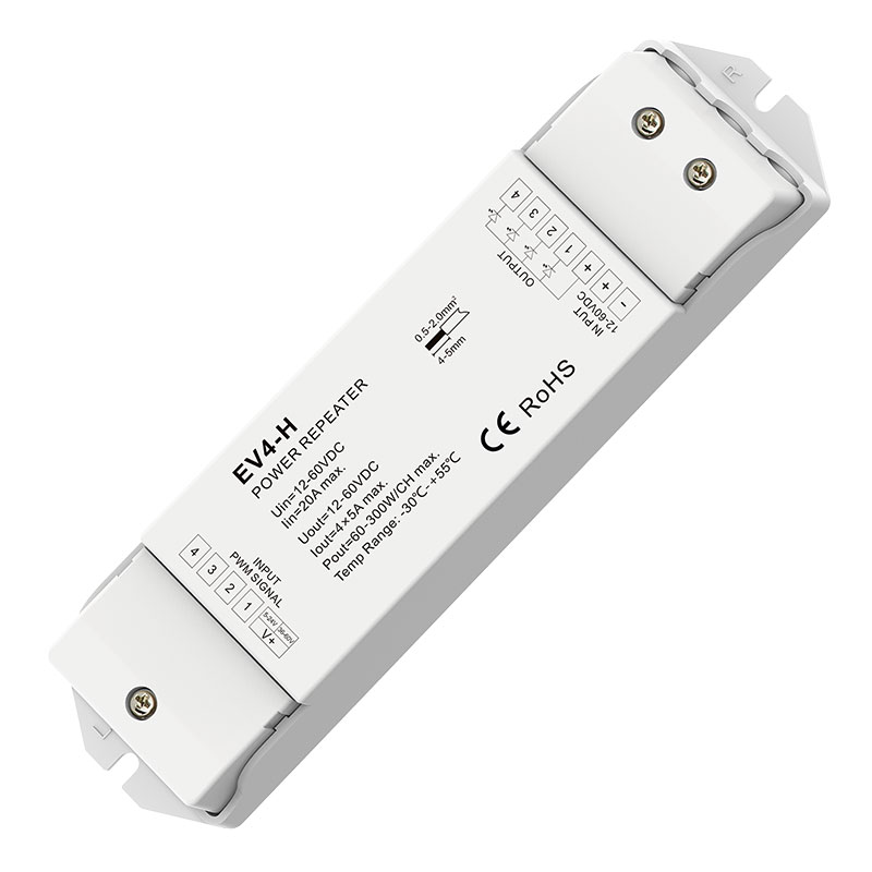 Built for advanced multi channel LED expansion, this 12–60V constant voltage data repeater features four independent output channels with up to 5A per channel. It boosts PWM control signals and supports unlimited system expansion via series or parallel connections, making it ideal for extending single colour, dual colour, RGB, and RGBW constant voltage LED strips or modules. Designed for stable power delivery and consistent brightness across large, complex lighting installations.