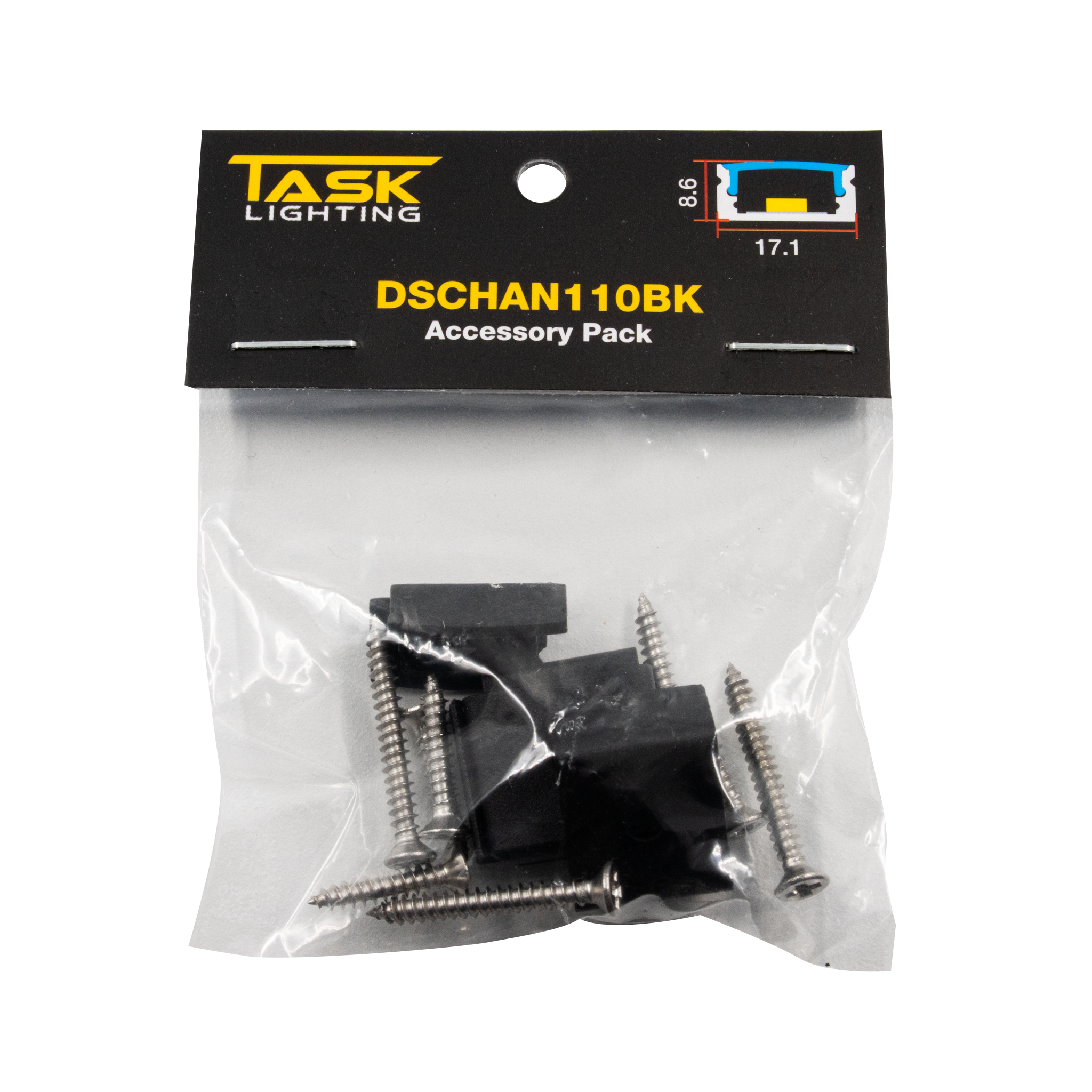 Accessory pack for DSCHAN110 Black profile. Accessories include 2 x Endcaps, 4 x Mounting Bracket & Screws.
