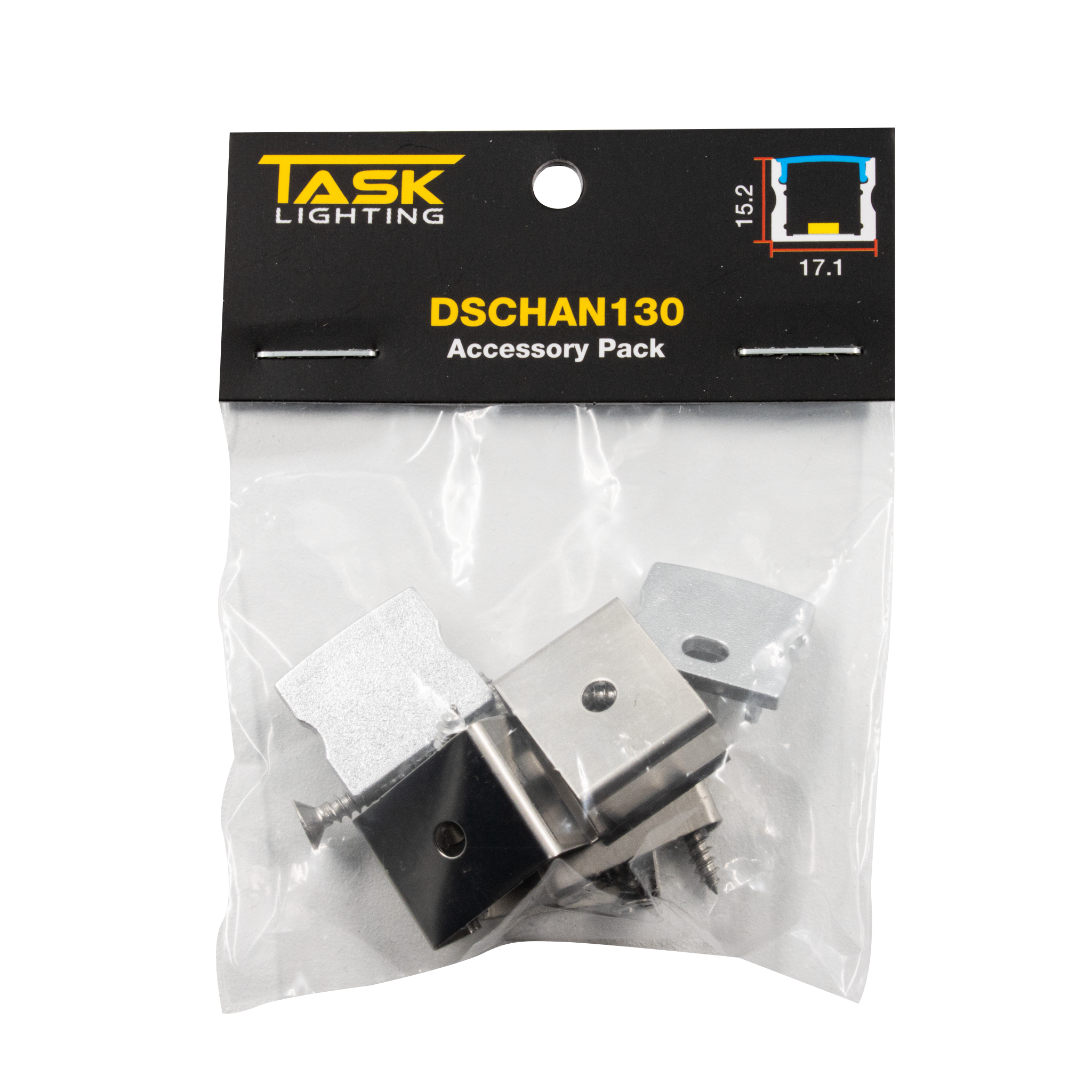Accessory pack for DSCHAN130 Silver profile. Accessories include 2 x Endcaps, 4 x Mounting Bracket & Screws.