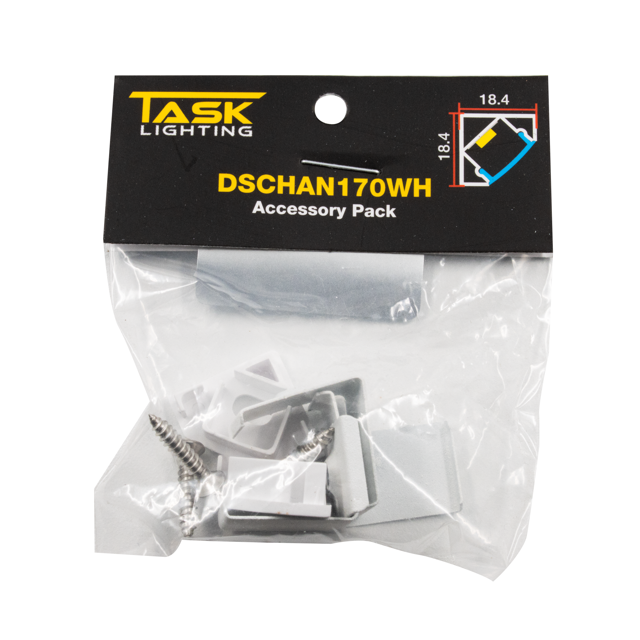 Accessory pack for DSCHAN170 White profile. Accessories include 2 x Endcaps, 4 x Mounting Bracket & Screws.
