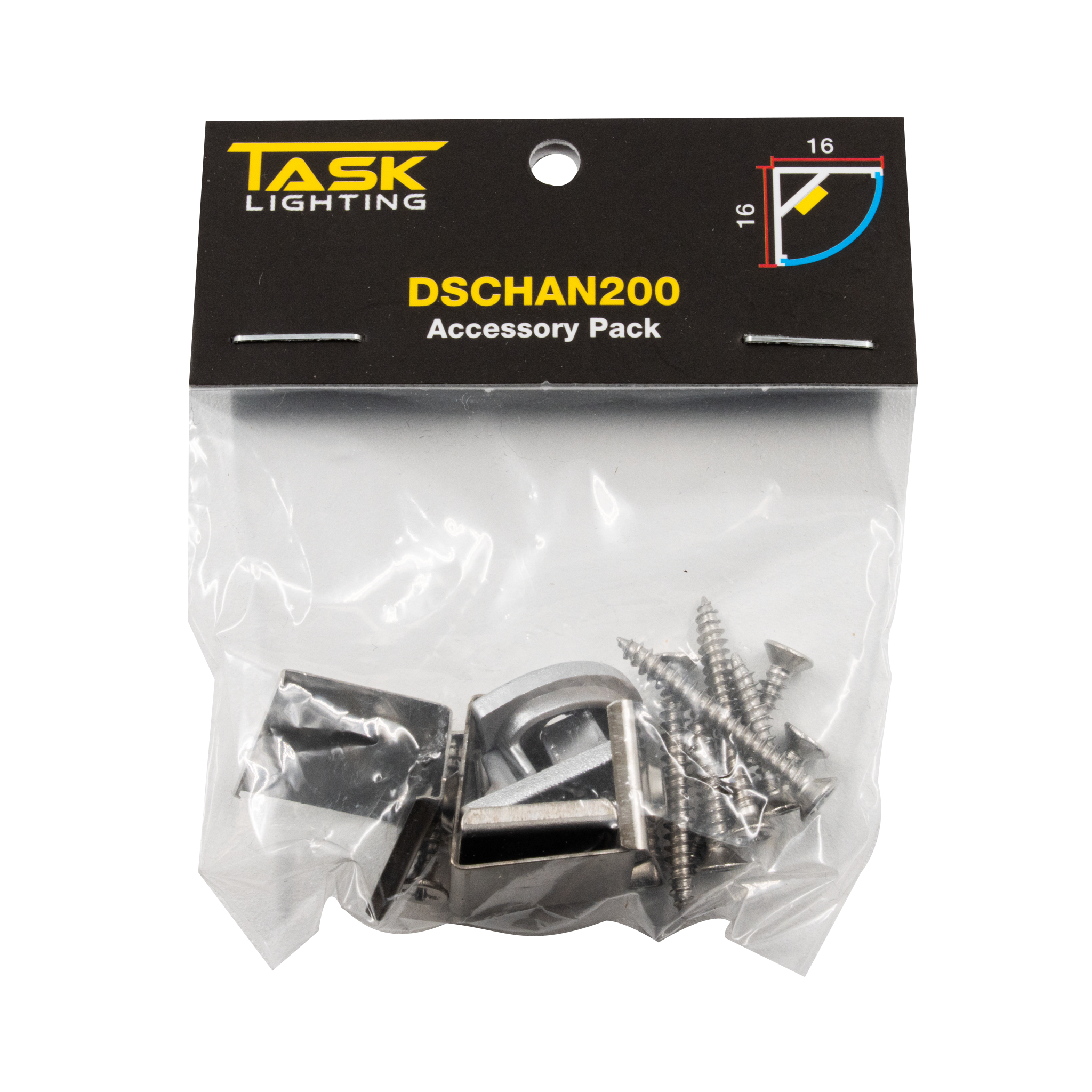 Accessory pack for DSCHAN200 Silver profile. Accessories include 2 x Endcaps, 4 x Mounting Bracket & Screws.