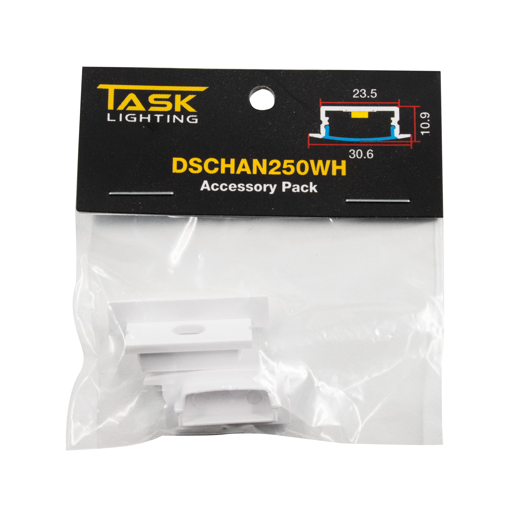 Accessory pack for DSCHAN250 White profile. Accessories include 2 x Endcaps.