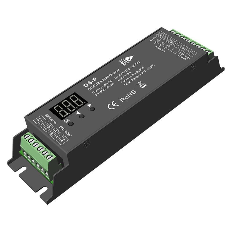 The D4-P is a DMX decoder designed for reliable lighting control, compliant with DMX512 standard protocols. Featuring a clear digital display, DMX start addresses can be easily set via onboard buttons or remotely through RDM communication from a DMX master console. With selectable 1, 2, or 4 channel output and flexible 8-bit or high-resolution 16-bit dimming, the D4-P delivers exceptionally smooth light control. A wide range of selectable PWM frequencies, along with linear or logarithmic dimming curves, ensures optimal performance across any application. Built-in over-heat, overload, and short-circuit protection with automatic recovery provide dependable, long-term operation.