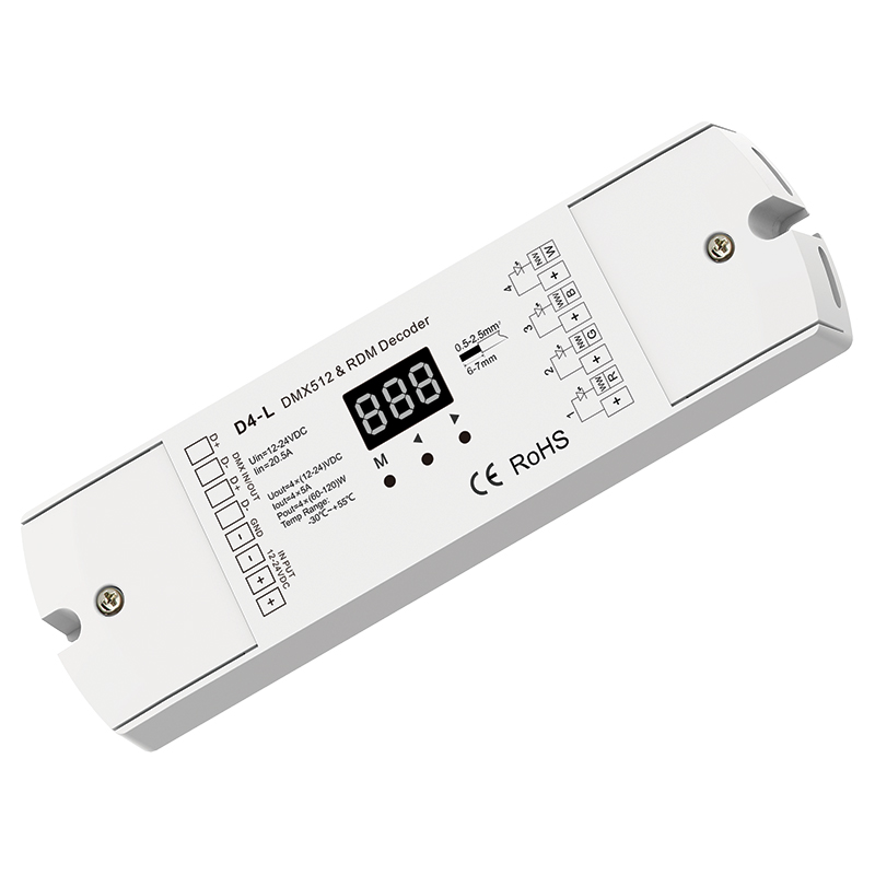 The D4-L is a versatile DMX decoder that is compliant with DMX512 protocols, featuring an easy-to-read digital display for quick address setup via onboard controls. With built-in RDM support, the address can also be configured directly from a DMX master console. Adjustable PWM frequency, selectable linear or logarithmic dimming curves, and flexible stand-alone or dimmer modes provide precise lighting control. D3-L offers stand-alone RGBW and 4-channel dimmer modes with built-in programs for button control without a DMX signal. Complete with automatic overheat and short-circuit protection for safe, reliable operation.