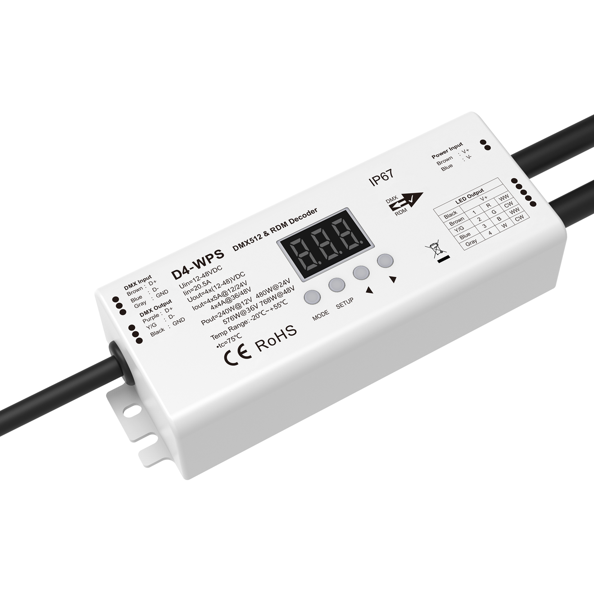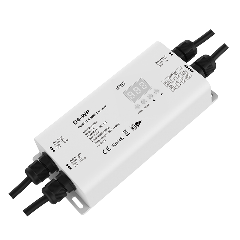 D4-WPS is an IP67 weatherproof DMX decoder designed for reliable outdoor and damp environments. It supports DMX512 and RDM, features a digital display for easy address setup, and offers 1, 2, or 4 channel output with smooth 8-bit or 16-bit dimming. With adjustable PWM frequency, linear or logarithmic dimming, and stand-alone RGB/RGBW and 4-channel dimmer modes, it delivers flexible control and comes with automatic overheat, overload, and short-circuit protection for safe operation.