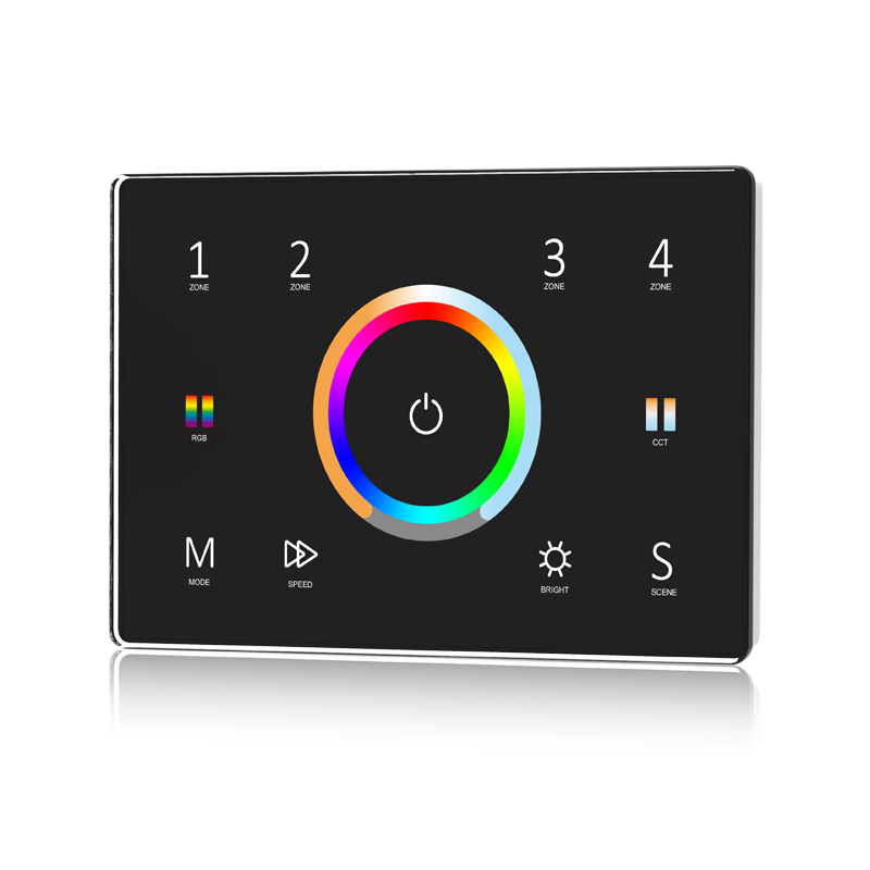 Designed for flexible lighting control, T15 glass touch panel supports DMX or RF control with a 4-zone remote function for RGB + TW (tuneable white) systems. Featuring smooth touch dimming, and wireless expansion via 2.4G RF controllers, it delivers precision control in a modern design.
