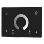 Designed for flexible lighting control, T11 glass touch panel supports DMX or RF control with a 4-zone remote function for single-colour systems. Featuring smooth touch dimming, and wireless expansion via 2.4G RF controllers, it delivers precision control in a modern design.
