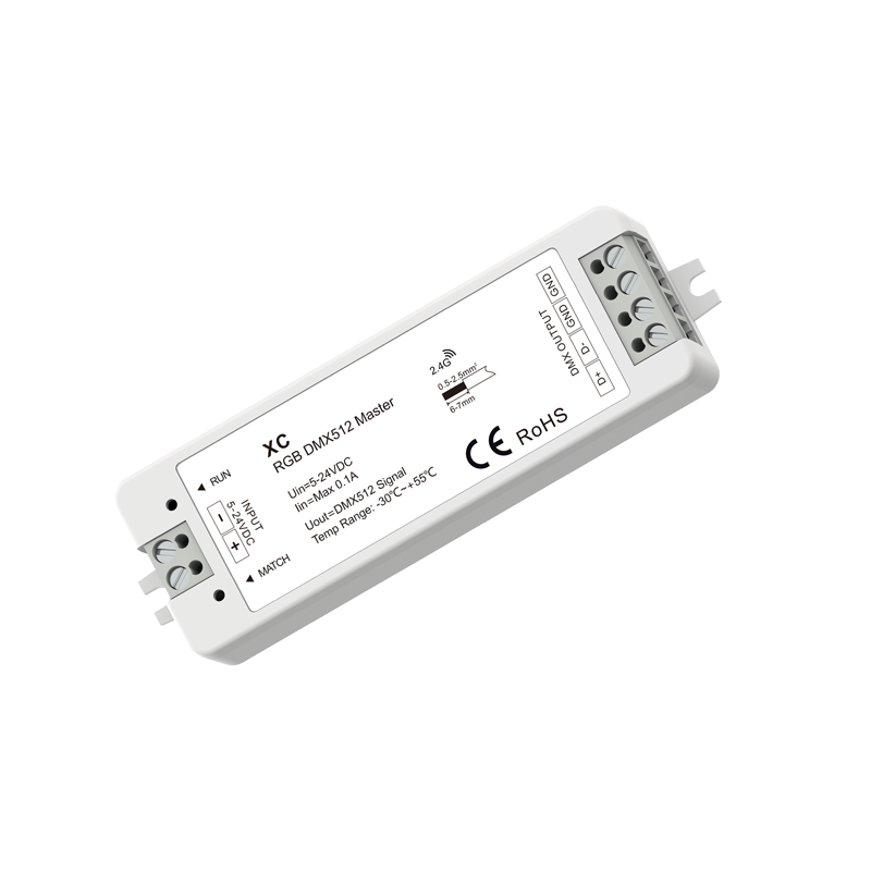Designed for flexible pixel lighting applications, the XC4 controller delivers DMX512 output, wireless RF remote control, and 32 dynamic effects including chase, flow, and running patterns. Compatible with DMX decoders and DMX pixel fixtures for seamless system integration. Max 170 RGB pixels or 128 RGBW pixels (512 Channels).