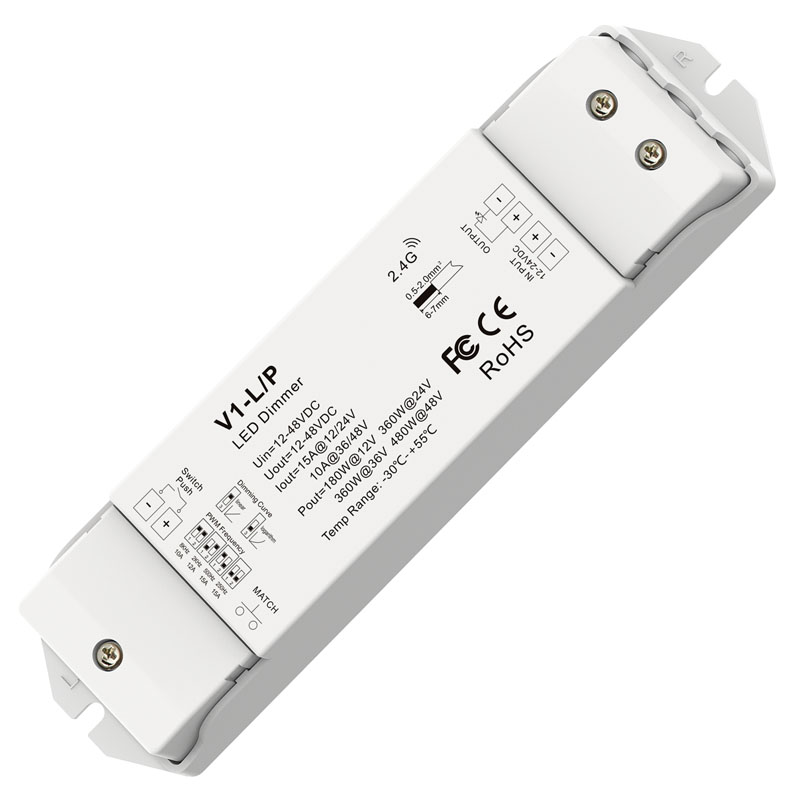 The V1-L/P dimming controller delivers smooth 0–100% dimming with 4096 brightness levels and supports single or multi-zone RF 2.4GHz remotes, with up to 10 remotes per controller. It features auto signal transmission for synchronized control, selectable dimming curves and PWM frequency, external push switch input, 3-second fade on/off and built-in safety protection.