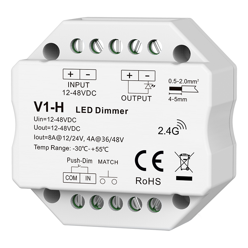 This V1-H RF dimming controller offers smooth 0–100% dimming with 4096 brightness levels and is compatible with single or multi-zone RF 2.4GHz remotes. It supports up to 10 paired remotes, features auto signal transmission for synchronized multi-controller control, includes a 3-second fade on/off option, accepts an external push switch, and fits neatly into a standard wall junction box.