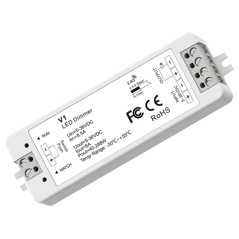 This V1 RF dimming controller provides smooth 0–100% dimming with 4096 brightness levels for precise, flicker-free control. It supports RF 2.4GHz single or multi-zone remotes, external push switching, 3-second fade on/off and synchronized multi-controller operation, with built-in safety protection for reliable performance.