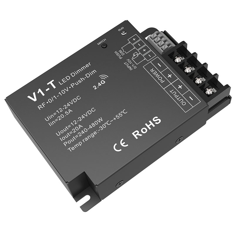 The V1-T 3-in-1 dimming controller supports RF remote, 0/1–10V and push-dim control in one compact unit. It works with 2.4GHz remotes, supports up to 10 paired remotes, features auto signal transmission for synchronised multi-controller operation, and allows simple on/off and dimming via an external push switch.