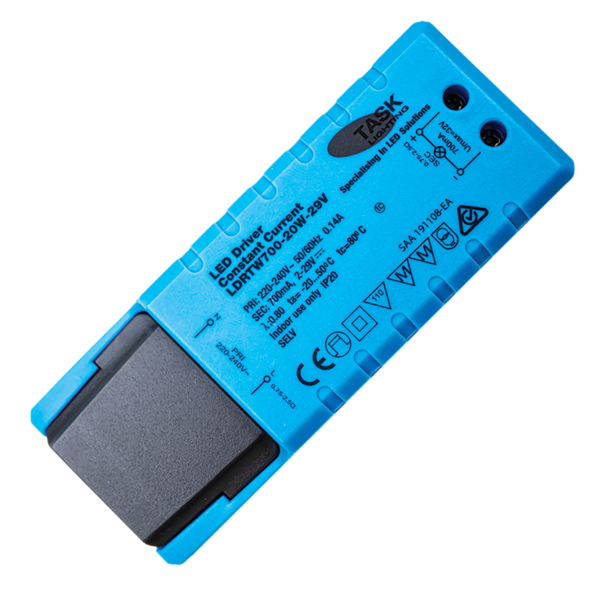 The LDRTW700-20W-29V is a robust IP20 rated constant current LED driver designed for reliable indoor lighting applications. Delivering a stable 700mA output with a wide voltage range, it supports LED loads from 1 to 20 watts, making it suitable for a variety of constant current luminaires. Engineered for easy installation, the driver features large loop through terminals for TPS cabling and a fast snap down 230V terminal cover for added safety and convenience. Suitable for indoor use, or exterior applications when enclosed in a compliant housing, this driver is backed by a 5 year warranty for dependable long term operation. Please note that this model is not phase dimmable.