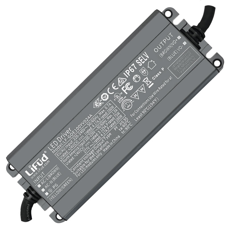 LF-GOE100YV024A is a 100W LED driver with a built-in potentiometer. This product was specifically designed for outdoor lighting, high bay lights and flood lighting projects. Super high efficiency and excellent heat-dissipation properties of GOE help to extend the product lifetime. The high-power-factor GOE makes better use of the power grid. Its low harmonic interference means low interference with the power grid and the electric devices in the circuit. All-round protection design improves the product stability which helps to save users’ maintenance cost. The potentiometer at the bottom helps to adjust the output voltage/power of the product, satisfying customers various demands. Also suitable for 100-277V input operation resulting in a 20% output de-rating.