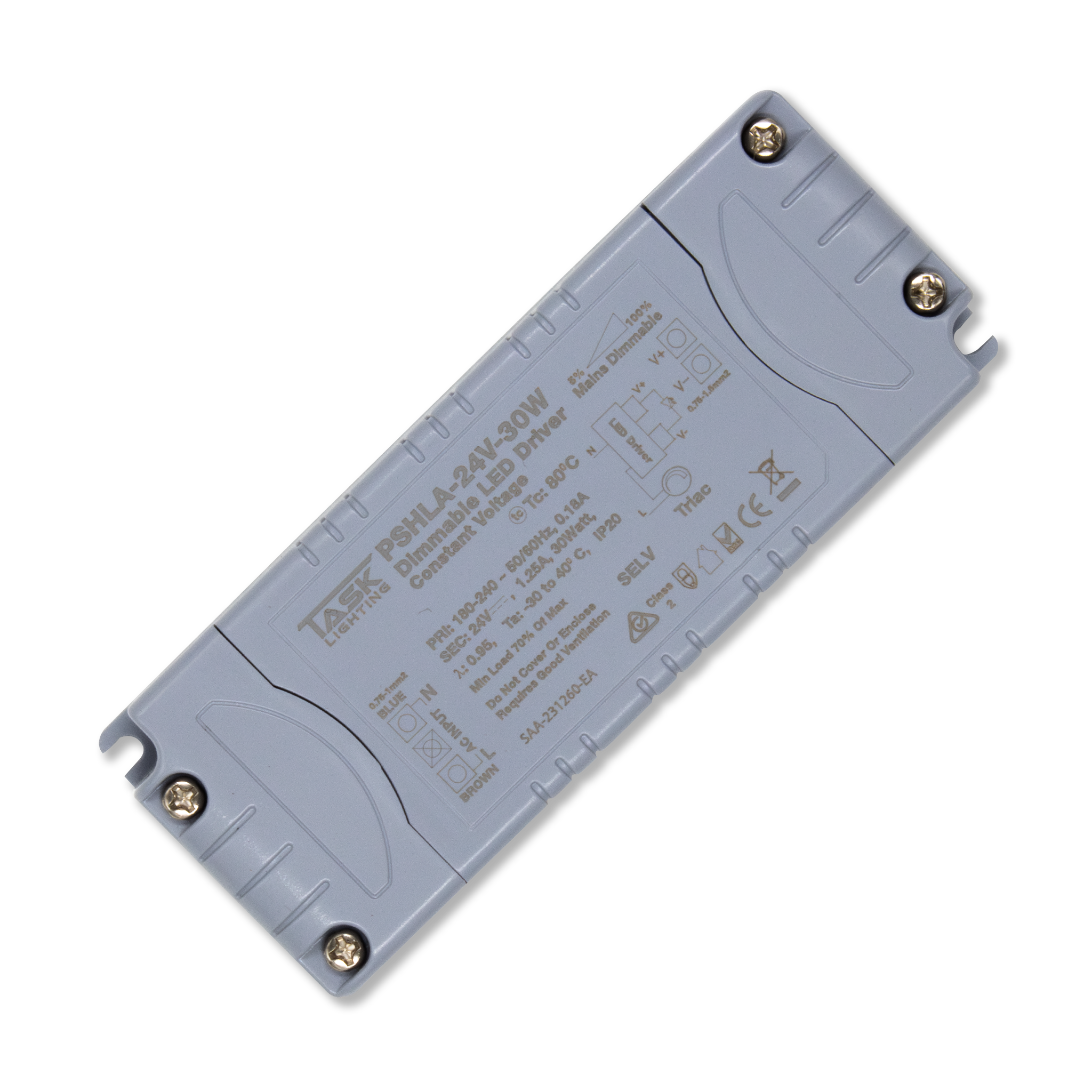 PSHLA drivers deliver a reliable 24VDC output, making them ideal for LED strip applications. Designed for efficient and dependable performance. Their compact form factor allows for easy installation across a variety of lighting setups. These drivers support smooth dimming from 5%–100% when used with a compatible dimmer and with a minimum 70% load, offering flexible lighting control for different applications. Built with covered terminals and designed to Class II & SELV standards, they provide an added level of safety and reliability. Available in a wide range of wattage's to suit a variety of applications and LED lighting outputs.