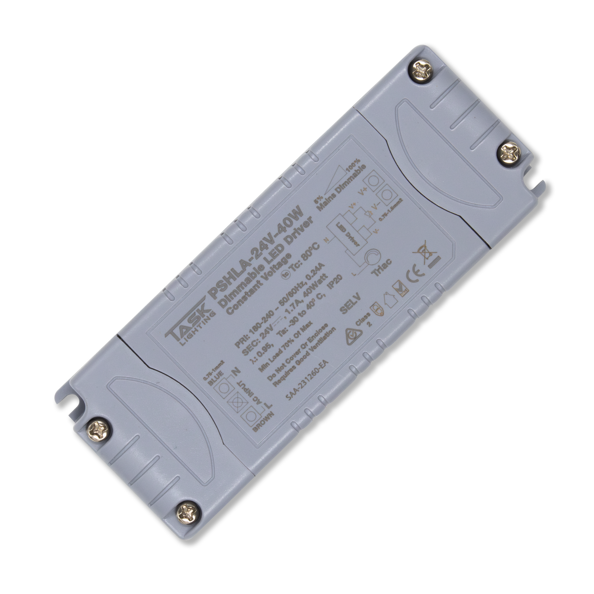 PSHLA drivers deliver a reliable 24VDC output, making them ideal for LED strip applications. Designed for efficient and dependable performance. Their compact form factor allows for easy installation across a variety of lighting setups. These drivers support smooth dimming from 5%–100% when used with a compatible dimmer and with a minimum 70% load, offering flexible lighting control for different applications. Built with covered terminals and designed to Class II & SELV standards, they provide an added level of safety and reliability. Available in a wide range of wattage's to suit a variety of applications and LED lighting outputs.