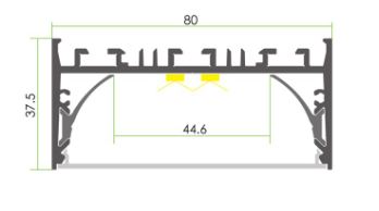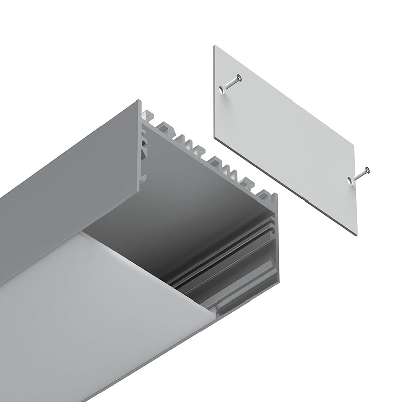 LEDCHAN270 is a large surface/suspended mounted profile designed for general applications that require high output LED strips. Its wide internal cavity is optimised for dual row configurations, or for a single row when used with reflectors that fit neatly into the side grooves to enhance light distribution.