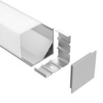 LEDCHAN370 is a large corner mounted profile designed to accommodate both interior and exterior sleeved LED strips. Its spacious internal cavity and square diffuser allow for uniform illumination, making it ideal for feature lighting, retail displays, and architectural accents. The clean geometric form enhances modern design schemes while ensuring smooth, even light distribution across surfaces.