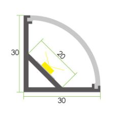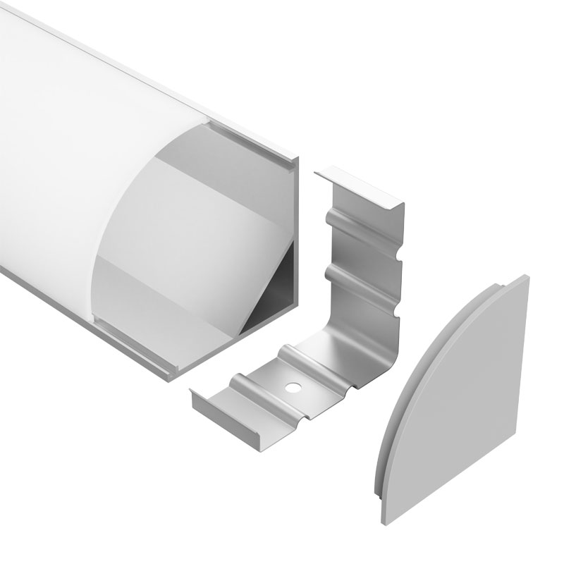 LEDCHAN380 is a large corner mounted profile designed to accommodate both interior and exterior sleeved LED strips. Its spacious internal cavity and curved diffuser allow for uniform illumination, making it ideal for feature lighting, retail displays, and architectural accents.