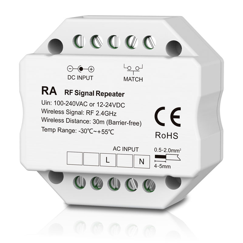 This RF signal repeater is designed to extend wireless control range while ensuring stable and reliable RF communication across larger areas. Ideal for synchronised multi-area dimming, it enhances signal consistency for smooth, unified lighting performance. Compatible with RF 2.4G remotes and control panels, and powered by either AC 100–240V or DC 12–24V, it features a compact design that fits neatly into a standard wall junction box for easy installation.