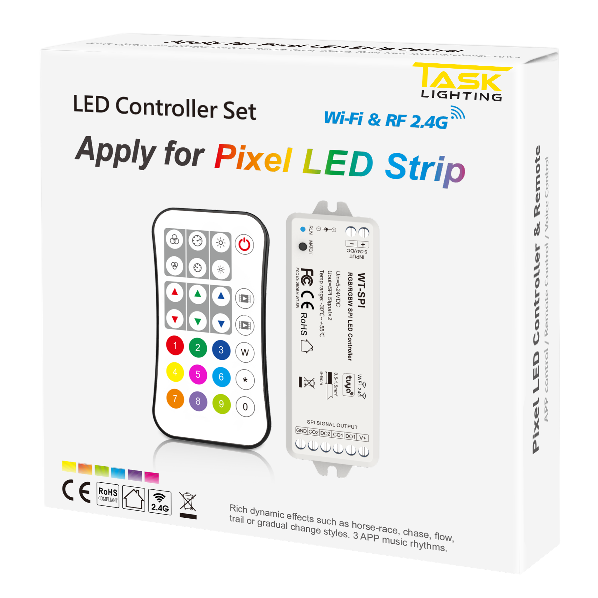 Out SPI controller kit is a versatile multi-pixel RGB/RGBW LED strip controller designed for dynamic and intelligent lighting applications. It supports a wide range of SPI LED strips, with adjustable IC type and colour sequence for flexible integration. Control is simple via the RF 2.4G remote or Tuya/Smart Life app, allowing users to adjust brightness, speed, pixel quantity, and lighting effects. The controller offers a variety of pre-set dynamic modes including chase, flow, and gradual transitions, along with custom scene options. Smart features such as voice control (compatible with Alexa and Google Assistant) and music synchronisation enhance user experience, while segment-based colour control enables precise, creative lighting designs.