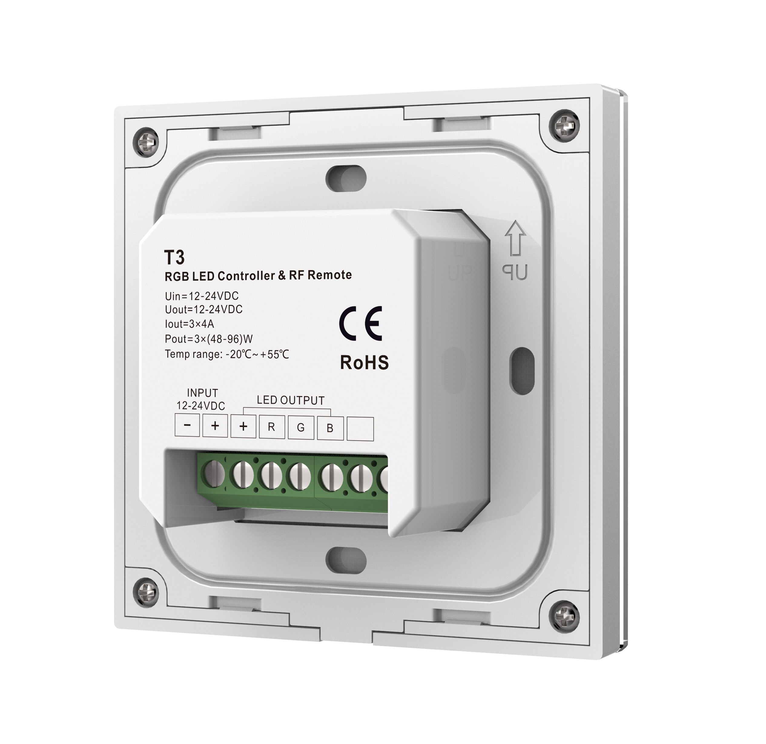 The T3 RGB touch wall panel delivers smooth, intuitive control for constant voltage lighting systems. Featuring an ultra sensitive, high strength glass touch interface with soft backlighting, it offers precise brightness and colour control at the touch of a finger. Compatible with RF 2.4G single-zone control, it provides flexible wired or wireless operation for modern lighting installations. Designed for premium interiors, it combines elegant styling with effortless performance.